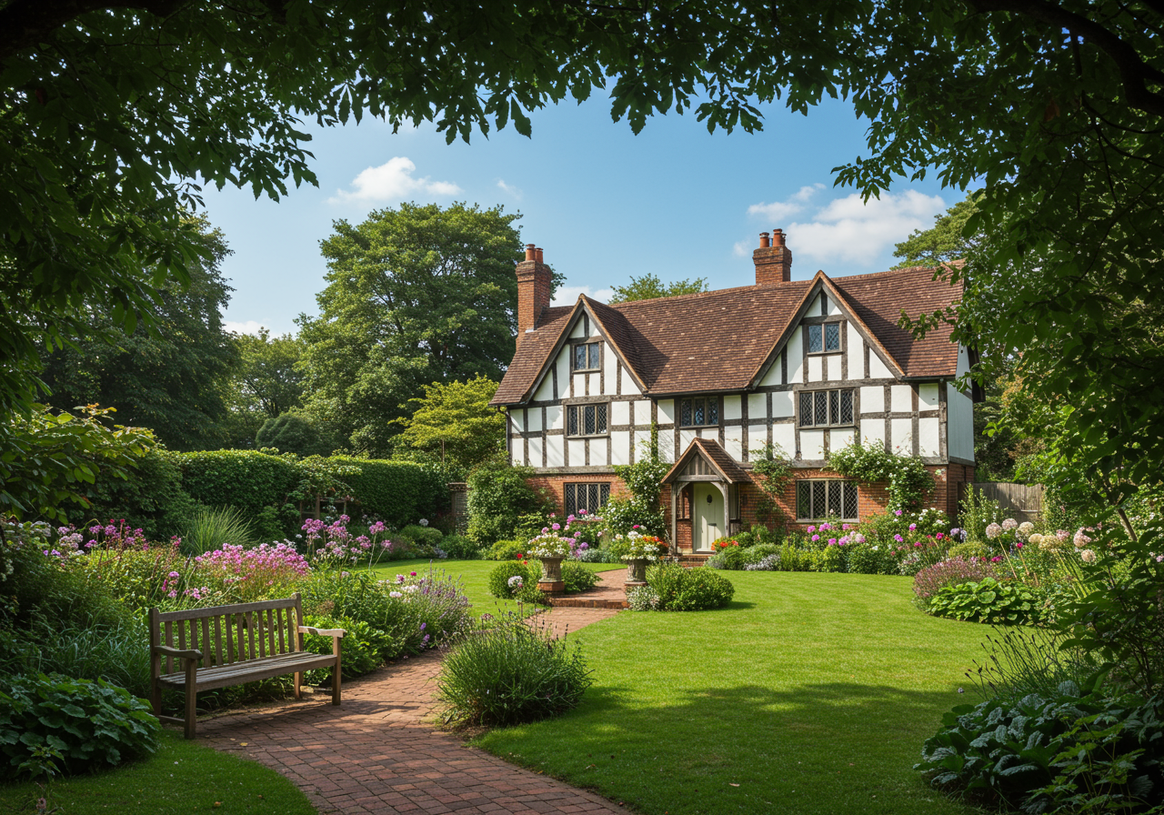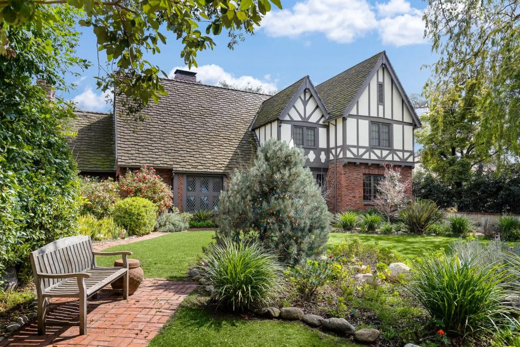 Recalling an enchanting cottage in the English countryside, this 1925 Tudor Revival residence captivates with its original architectural details, beginning with a classic timbered and brick façade. The 3,383-square-foot interiors feature living and dining rooms with hardwood floors, a wood-paneled library, a sunroom, a light-filled kitchen and breakfast room, four bedrooms, and a brick patio ideal for alfresco dining and entertaining. Strewn with mature oaks, the half-acre grounds offer ample parking, a freestanding two-car garage with attic storage space, and a 750-square-foot studio.