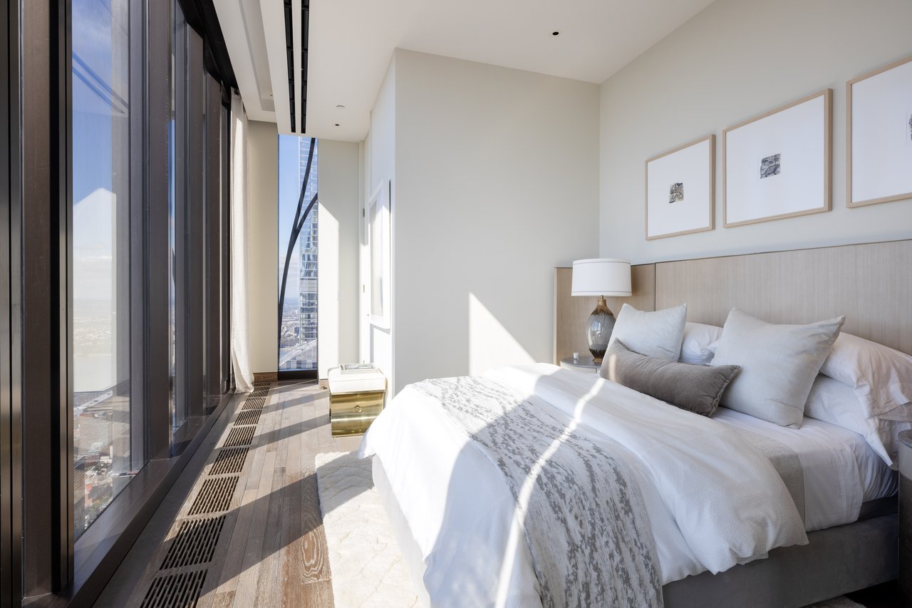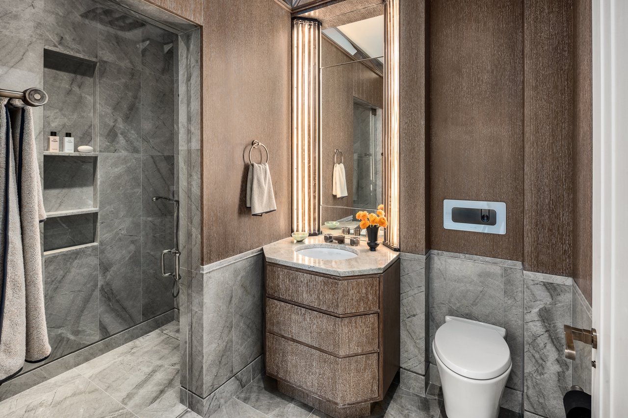 The secondary bedrooms, each with striking views are all generously proportioned with en-suite bathrooms finished in a distinctive crystallo gold quartzite and custom Studio Sofield designed fixtures.