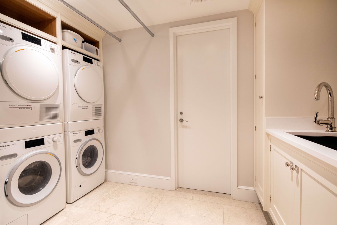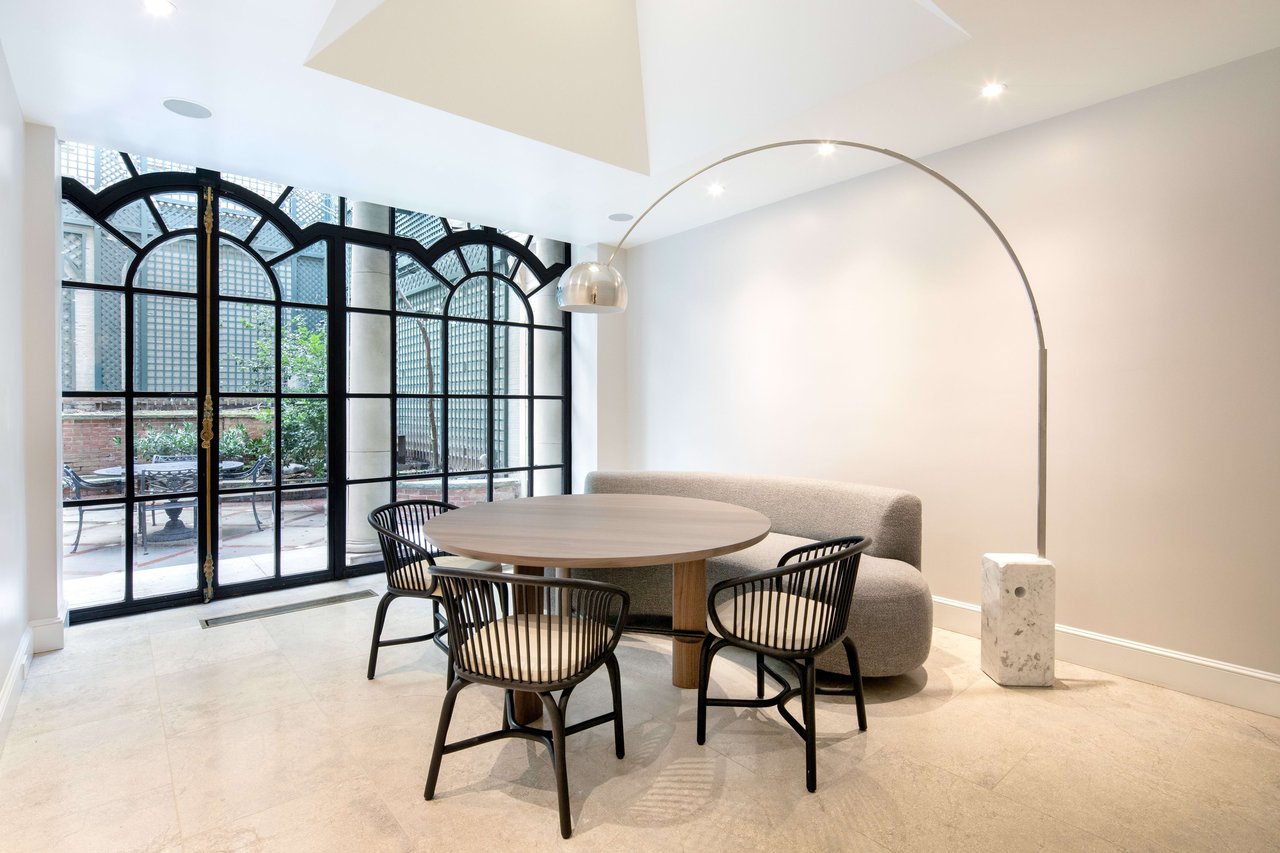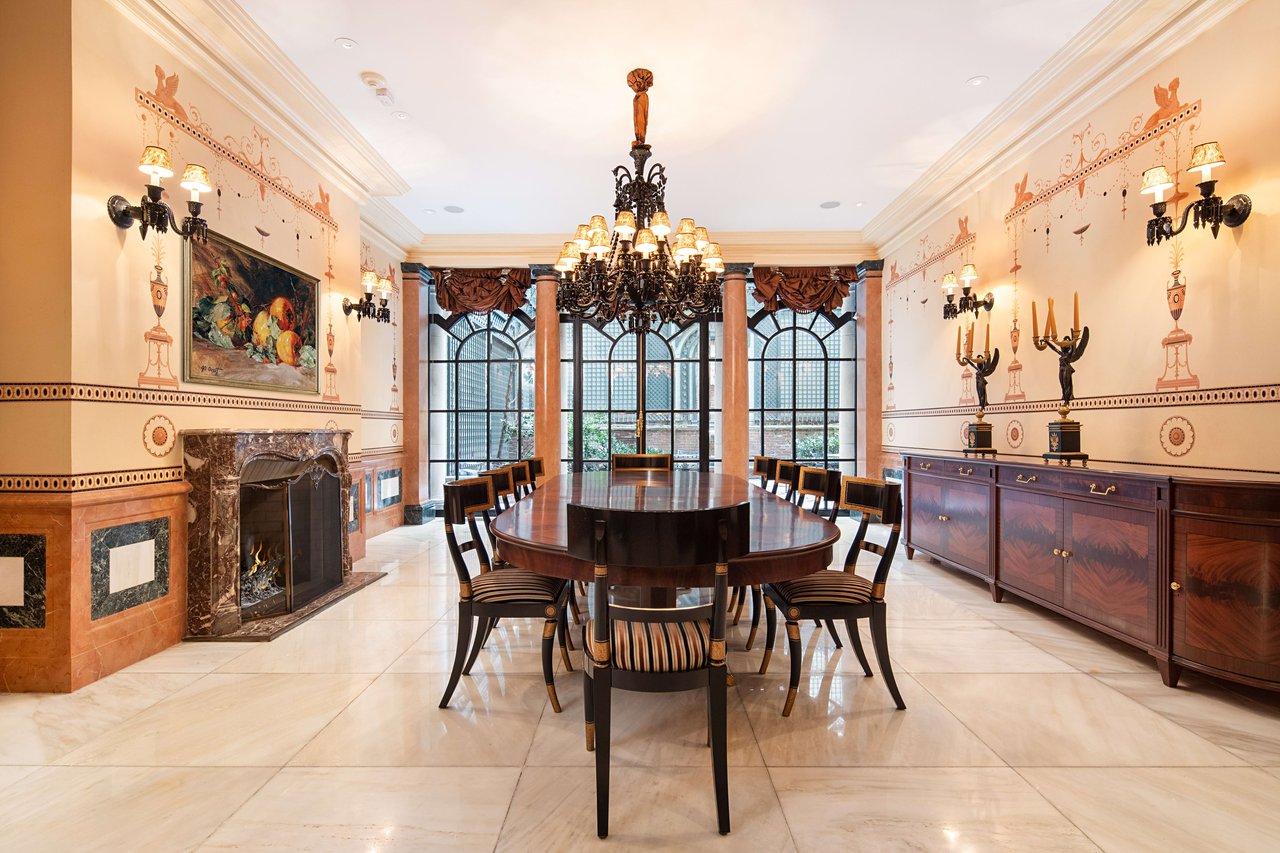 Garden Level: A fountained reception area leads to the dramatic Grand Dining Room. The canvas walls are hand painted and inspired from Robert Adam's Etruscan Room in Osterley Park. This spectacular room opens directly into the most beautiful private Garden oasis in all Manhattan. Also enjoy a newly renovated Smallbone Eat-In Kitchen, a Breakfast Room that also opens to the Garden. A Laundry Room is located nearby.