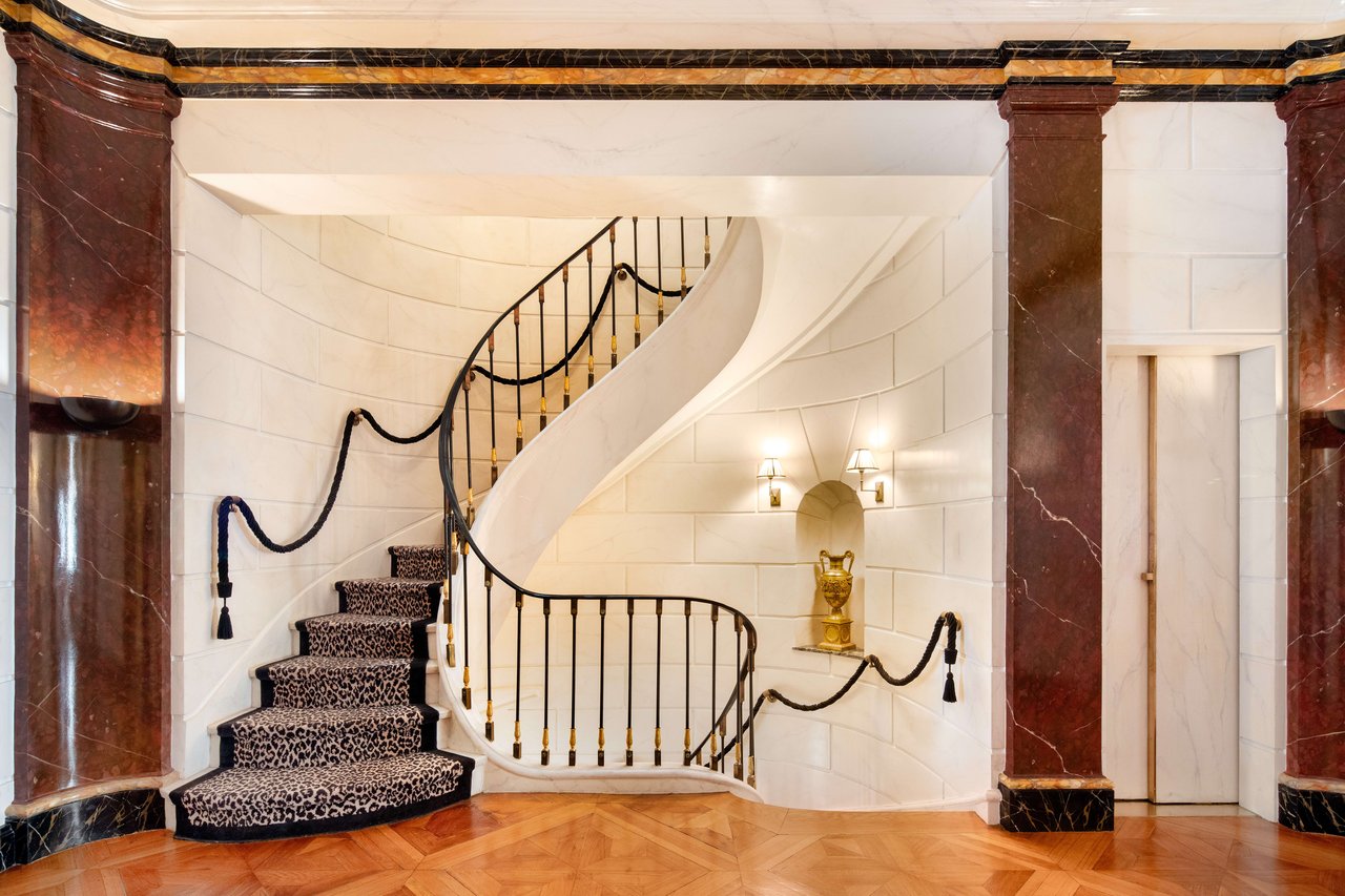 Entry Level: Two entries provide separate Main and Service doors opening to a dramatic marble Gallery showcasing a circular sweeping Staircase and Elevator. This Grand Reception area features a complex geometric motif incorporating the Greek key, a theme throughout original decorative details from the house. The Grand Reception opens to the full-width Balcony overlooking the Garden. A Cloakroom, Powder Room, Staff Bedroom Suite and service stairs to the Garden Level complete this floor.